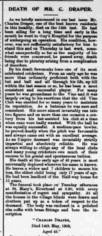 The Sevenoaks Chronicle carried an obituary of Charles Draper